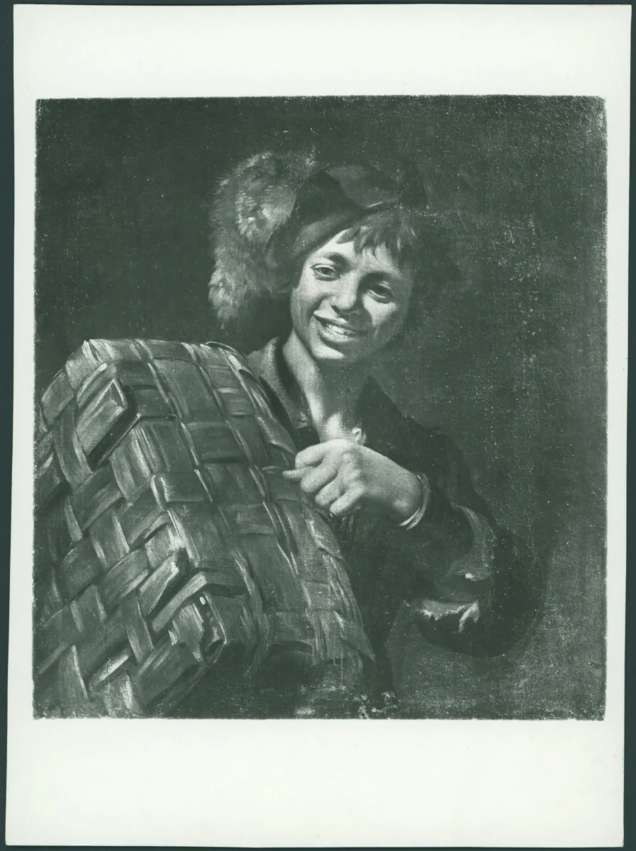 Anonimo caravaggesco italiano - sec. XVII - Figura maschile con cesta mentre compie gesto volgare