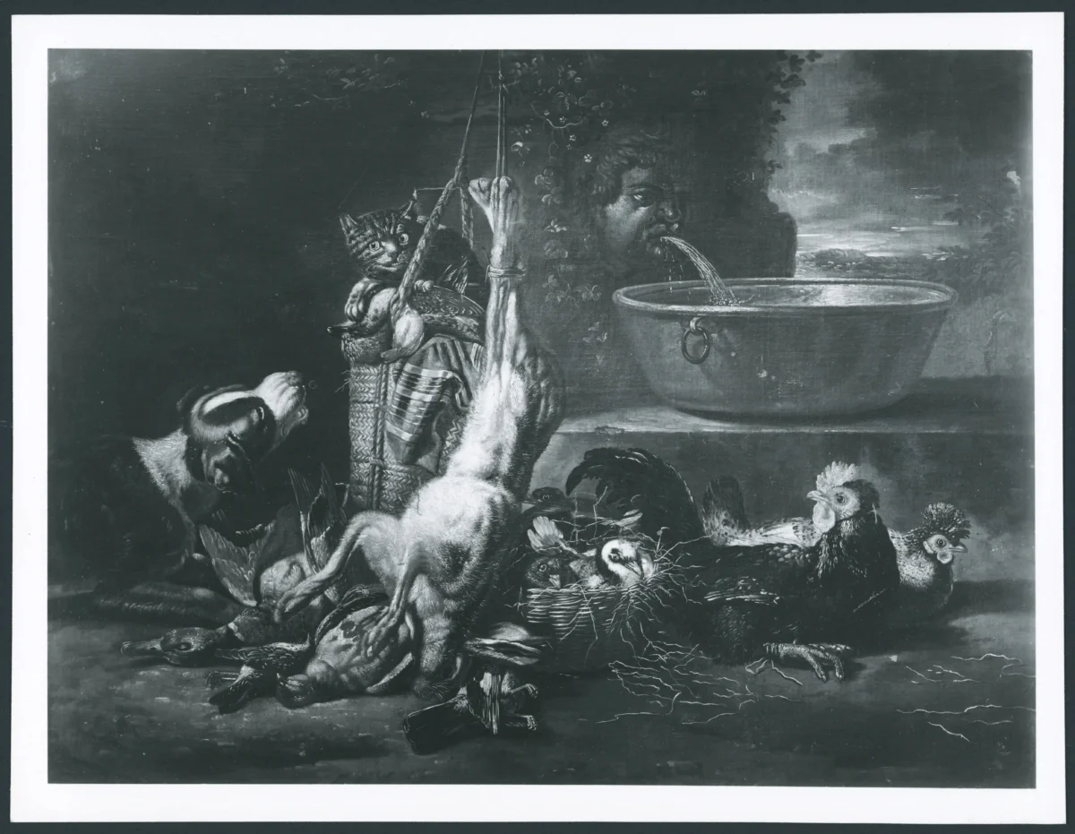 Coninck David de - sec. XVII - Natura morta con selvaggina, pollame, cane e gatto