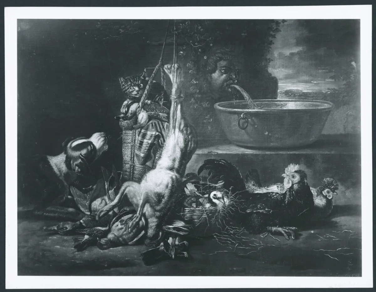 Coninck David de - sec. XVII - Natura morta con selvaggina, pollame, cane e gatto