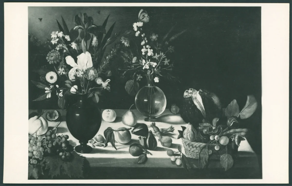 Merisi Michelangelo (Caravaggio) - sec. XVI - Natura morta con frutta, cesto e vasi di fiori